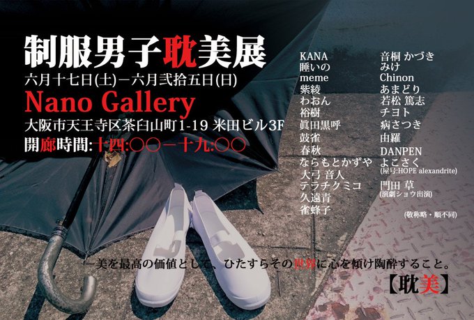 6/17(土) より天王寺Nano Galleryさまにて開催の【制服男子耽美展】に水彩作品3点出展いたします。今年はちょっと別の方向から私なりの耽美を考えてみました…。