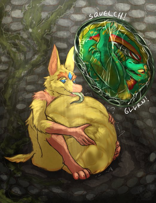 @saphirosphere Here’s two of my OC’s I’d love to see in your style tbh. My fuzzy gremlin gripping their voregut excitedly or a silly ‘game over’ type vore sketch of my koopa-thing OC. If chosen I’d love to colour the sketch if allowed.