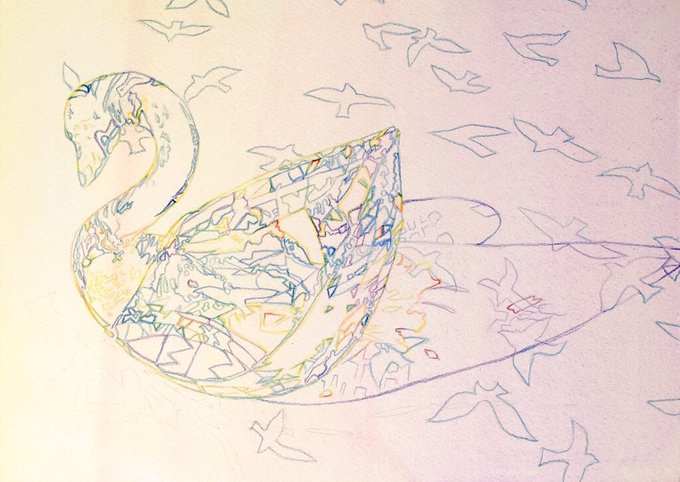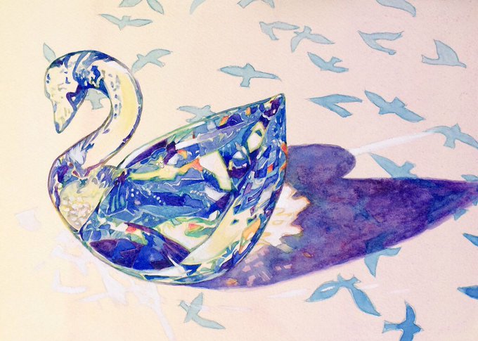 『白鳥』(swan)今度は線画残してた(^ω^)使用画材・ホルベイン透明水彩、カランダッシュ水彩色鉛筆、ターナーアクリルガッシュ、マーメイド紙 #透明水彩
