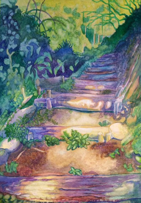 『山道にて』使用画材・ホルベイン水彩絵の具、ターナーアクリルガッシュ、カランダッシュ水彩色鉛筆 木漏れ日表現できたかな…風景は静物より没頭して描いてしまいます。