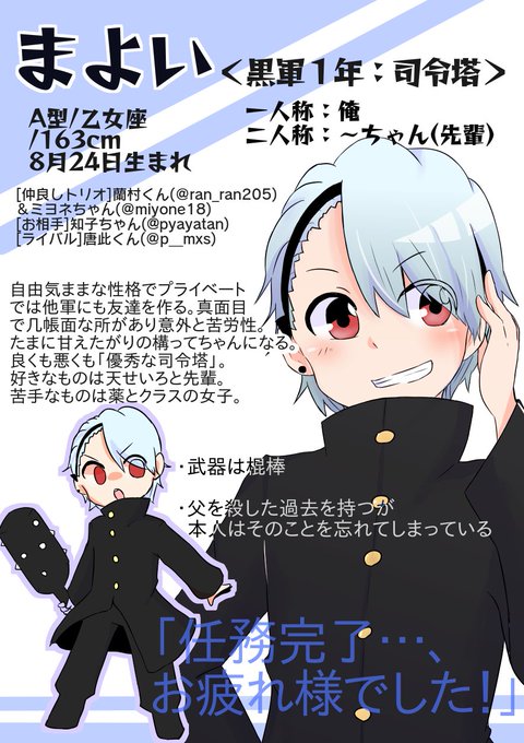 前半三人のキャラシ出来ました〜よろしくお願いします!学戦好きさんと繋がりたい絡みたい✨#学生戦争でフォロワーさんも初見も敵軍も絡みたいそしてあわよくば仲良くなりたい #学生戦争