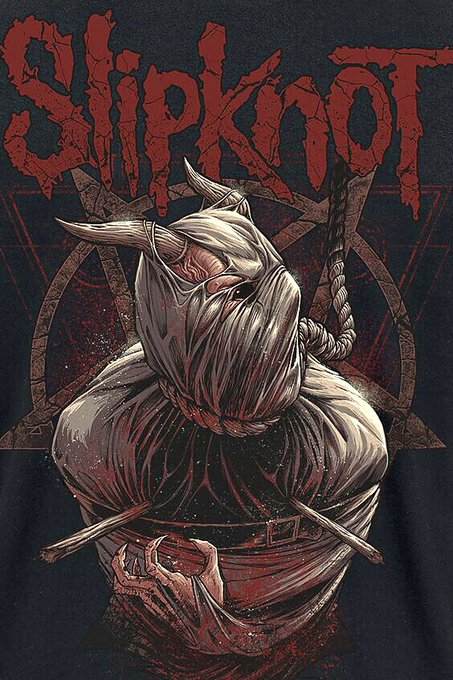 【スリップノット】2020年最新型。フロントには拘束具を着けられ首に縄をかけられた悪魔のイラストをデカデカと配置し、バックにはお馴染みのトライバルロゴと新型魔法陣を組み合わせたグラフィックをプリントしたTシャツ。いかにもなデザインといかにもな配色でまとめられた安心安定の堪らない1枚。