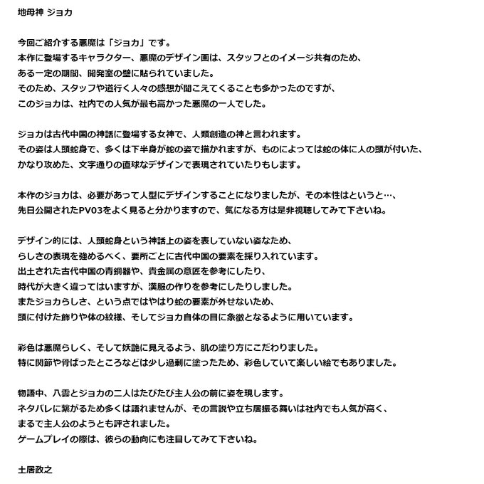 本作に登場する、土居描き下ろし悪魔の紹介企画もいよいよ最終回となりました。今回は、以前紹介した新規悪魔「ジョカ」の、蛇身化した姿について紹介します。