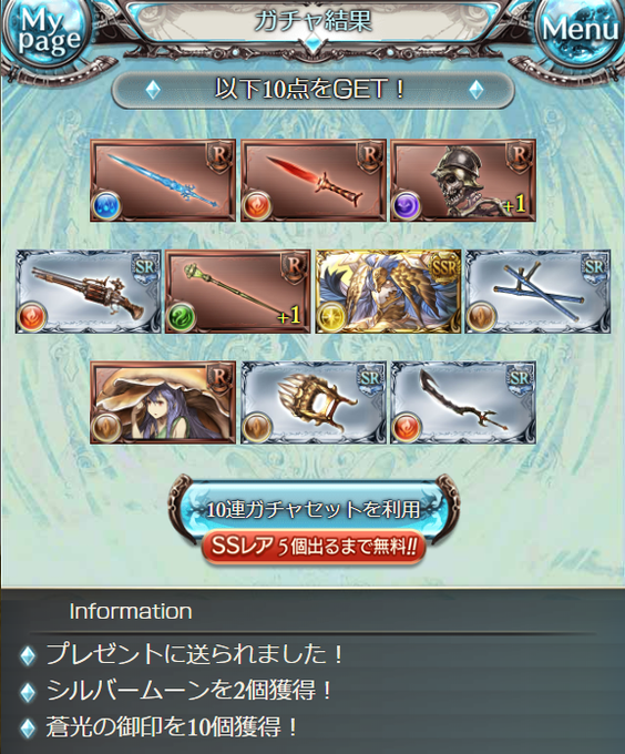 スーパームックモード 10連目⇒SSRメタトロン(光)[召喚石],シルバームーン×2 20連目⇒SSRウコンバサラ(光)+ゴールドムーン×1,ブロンズムーン×2