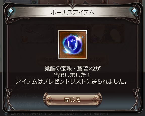 Y!版グラブル ストイベ報酬のSSR確定チケ×1と金綬の贈り物×4の結果。SSR確定チケはハズレだったけど、金綬で金月と宝晶石が出たから、まあ良し。