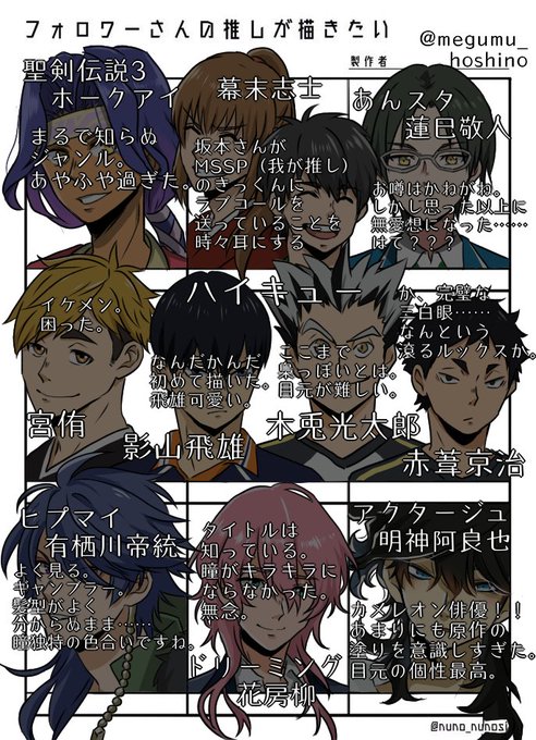 初描きばかりのキャラでほぼほぼ模写になってしまった……もはや、描いた意味はあるのか。リクエストありがとうございました。ハイキューのところみたいに枠を無視すれば行けると思ったんですけどあぶれました。
