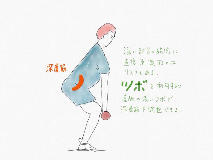ツボならでは特徴の一つに「深い筋肉の調整」があげられる。指では届かない深さにある筋肉にはマッサージによる調整はむずかしい。ツボを利用すると遠隔からの刺激でありながら深い筋肉を調整できる。深い部分に直接鍼を刺すリスクも負わない。ツボの強みである。