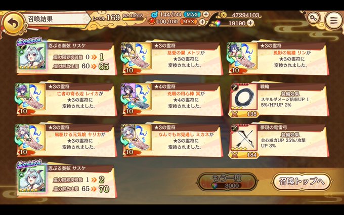 90連してPU掠りもせず恒常勤務になったよしちゃんしか来なかったことご報告します とうとう単発神話崩壊しましたが報酬&交換でイクサ姉妹揃える最低ラインは確保 #ミナシゴノシゴト