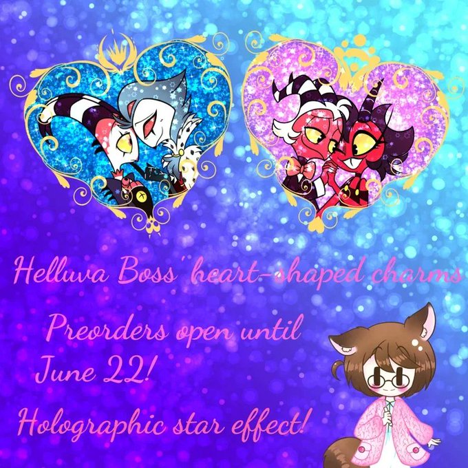 3 days left for you to preorder some great #HelluvaBoss' products on my Etsy store♡. Heart shaped charms, dakimakura's cover sheets and pillow charms.