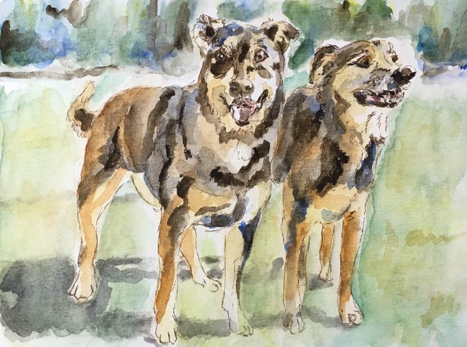 Tonight’s quick sketch/painting. Daisy and Melvin, in Banff, the day before Daisy crossed the Rainbow Bridge. ❤️😢 #watercolour #artjournal #pentalic365 #yycdogs #yycdog #yycdoglife #banff