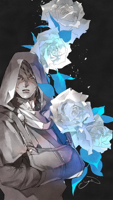 下書きまではデジタルなので人物と花は分けて描いてます 花はぐるぐる位置を変えたり左右反転してみたり最後までバランスに悩みながらの作業
