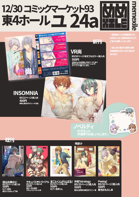 C93おしながきです 12月30日 東ホール ユ-24a「めめXILE」で参加します ■新刊サンプル■ https://t.co/qiJCayObm1 https://t.co/jVWFpMpZYy 3枚目の画像は当日掲示予定のポスターのイラストです 既刊のサンプルもピクシブにアップしてるのでご確認頂けるとありがたいです😊よろしくお願いします💕