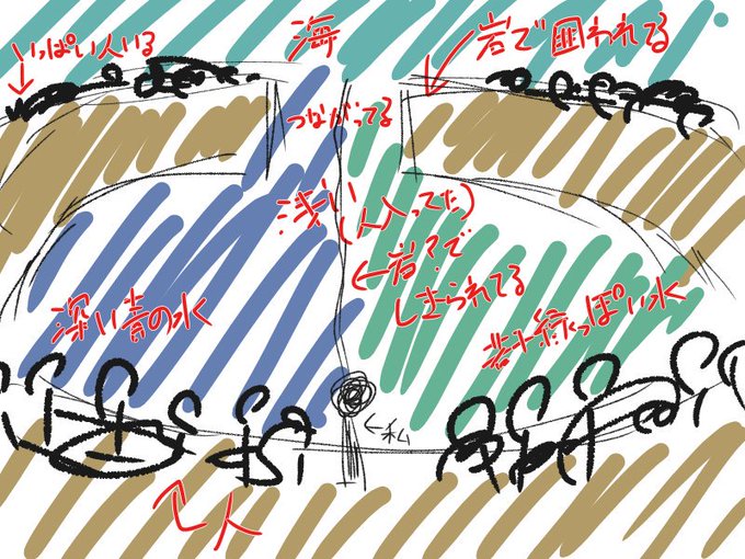 今日の夢で見た景色のメモ 建物とかこういう景色とか、どこで情報手に入れたんだってレベルで普段の私の発想力じゃ思いつかないものなので、すごいなって思います 中央で複数人がなんかしてて、それをみんなが覗いてた