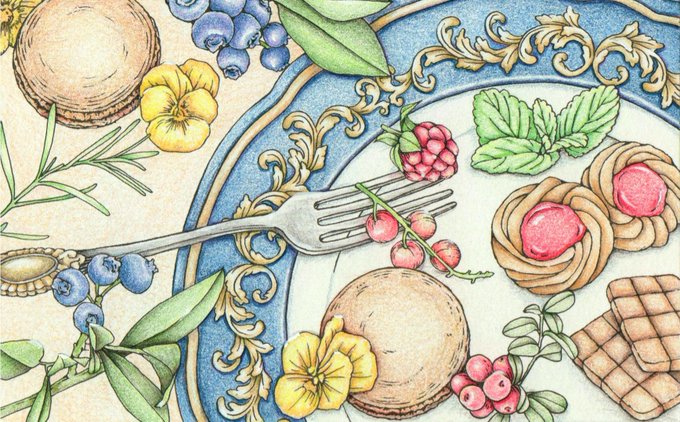 心ときめく四季のワルツから お菓子塗るの楽しいけど、だんだんお腹が空いてきて何かしら食べてしまうのはどうしたらいいんだろ😅 #大人の塗り絵