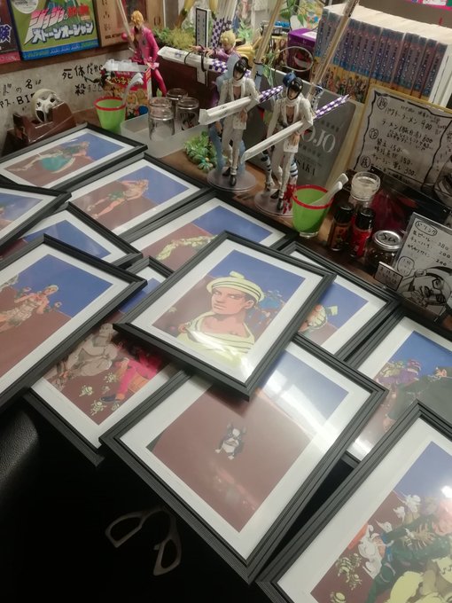 本日はジョジョ展の絵を額縁に入れて壁に貼りまくり店長