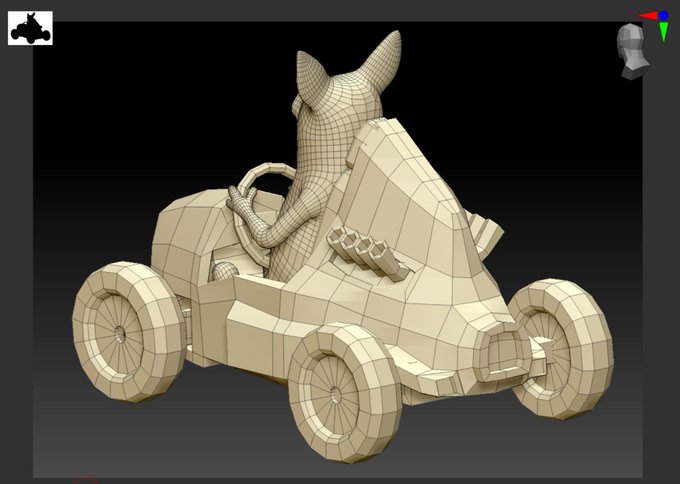 UE4用のローポリ車両をZBrushで製作中。開け閉め処理で挫折したことあるので、とりあえずドアのない車にしてます。わはは。 #zbrush #gamedev #UE4