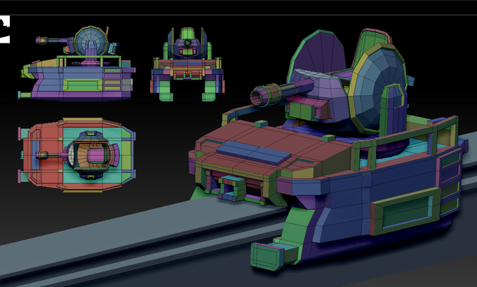 ぷちコン用のゲームの前半はレールシューターにしたらどうかなあ…と思いついて、Zmodelerでモノレール式移動砲台作ってます。 #UE4ぷちコン #zbrush