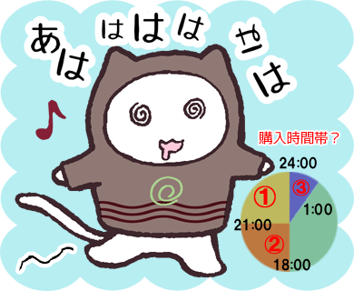 数日売上チェックをこまめにしてみて。購入される時間帯は、18:00~25:00に集中していて、6:00~18:00はあまり動きがないのだな~と。そりゃそーか(^。^)
