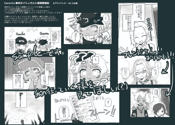 【夏頭割り】漫画のサンプル。イシュガルド復興のランキングに挑戦した時のプレイ日記となります。A5/28p。4枚目は自機ララフェル達のアクリルスタンドサンプルとなります。