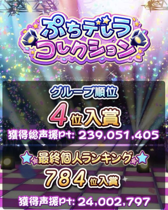一緒に走ってくれたちひペロのみなさんありがとうございました〜プロ1位本当におめでたい!! 個人の方もここまで上を目指せるとは思っていませんでした。スタ走り3年分のエナドリは大きかったです。 これからも楽しみつつ、かな子を応援していきますので、引き続きよろしくお願いします!