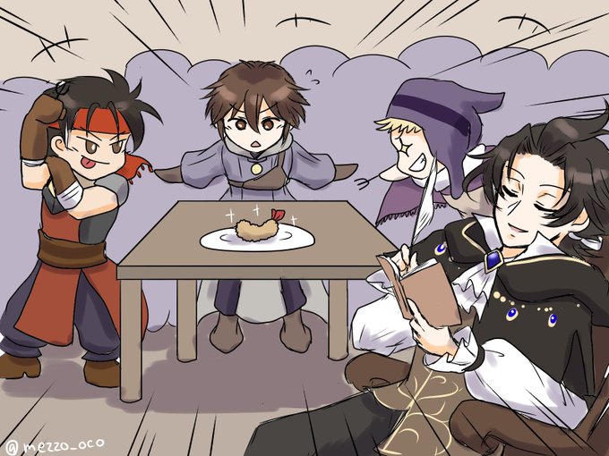 最後に残ったエビフライをかけた戦いを仕切る幣旅団の選ばれし者マイルズ君を「なるほど、普段は控えめだがこういう時のノリは良いんだな」と観察研究するサイラス先生の図(長い)