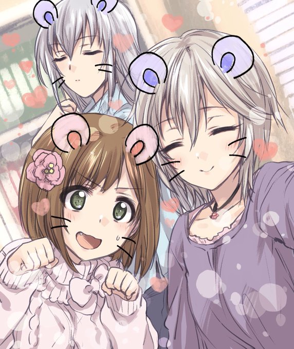 新年初自撮りするにゃん・にゃん・にゃん。 アーニャ「みくも、ノアも、一緒に撮りましょう♪」 みく「いいよー!…ってこの加工、ネズミにゃー!?」 のあ「…新たなる年の…象徴……必要ならば…抗わないわ」