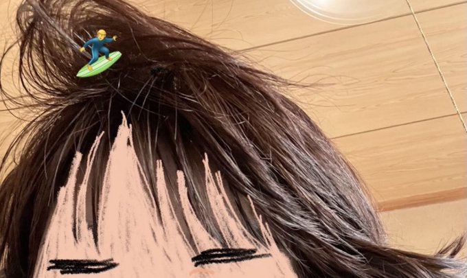 (前髪ビッグウェーブにサーフィン🏄♂️の絵文字スタンプを置いて拡大したら、小さいのに意外と細かい所までしっかり描写されててびっくりした思い出)