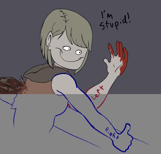 her right hand is supposed to be leaning on the stake or giving a thumbs up as shown here. i know left from right im just a shitty artist
