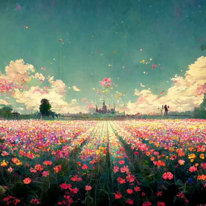 『Way to flower filed』 #midjourney 割とお気に入りだな……と思ってたらまたmidjourneyに1時間貰えたので他の人にも気に入って貰えたんだろうな