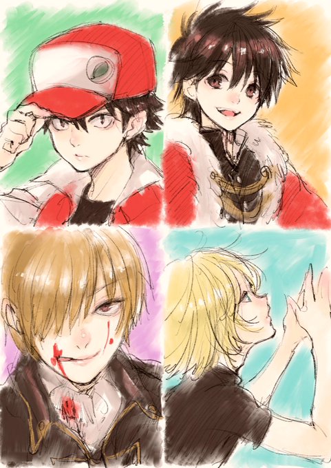 友達とやった新旧推しキャラをとりあえず4人描くあそび! 赤黒金まみれだ… 左上からレッド、渋谷有利、沖田総悟、ユーリプリセツキー 被ったら握手してください🤝