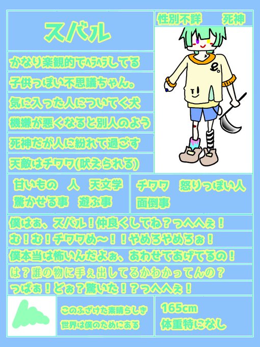 @ODANOBU_USA のらさんの絵柄で見たいのはこいつ! すばる! 一応死神くんです、チワワが嫌いなのが特徴です!!