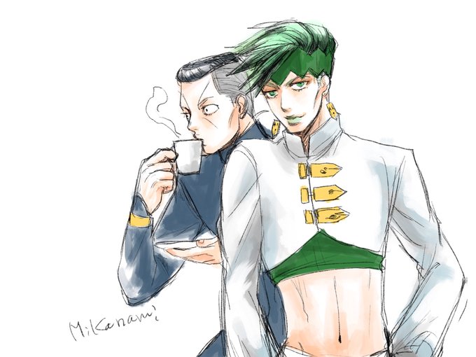岸辺露伴ルーヴルへ行くようやくゲット記念の、露伴と茶飲み仲間億泰。やっと露伴先生の描き方つかんだ。