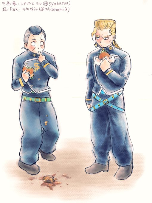 @syakatoo 足しびれた兄貴とちょっと迷ったのですが、この兄弟こういうこときっとあるあるなハンバーガーの中身落としちゃう億泰と兄貴を自分絵で描きました。一緒にハンバーガー食べる兄弟という状況がまず可愛すぎてですね…好きです。