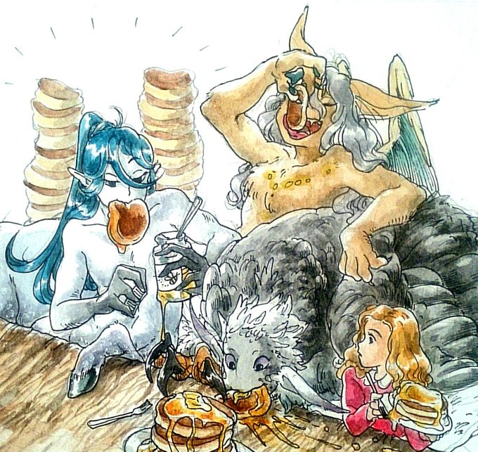 @mikeneko0316 山盛りホットケーキは鳥少女たちに 甘くってまあるくてフワフワで蜂蜜かけ放題に大喜びな人外ズ 人外ズのお行儀の悪さにビックリな少女