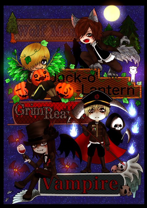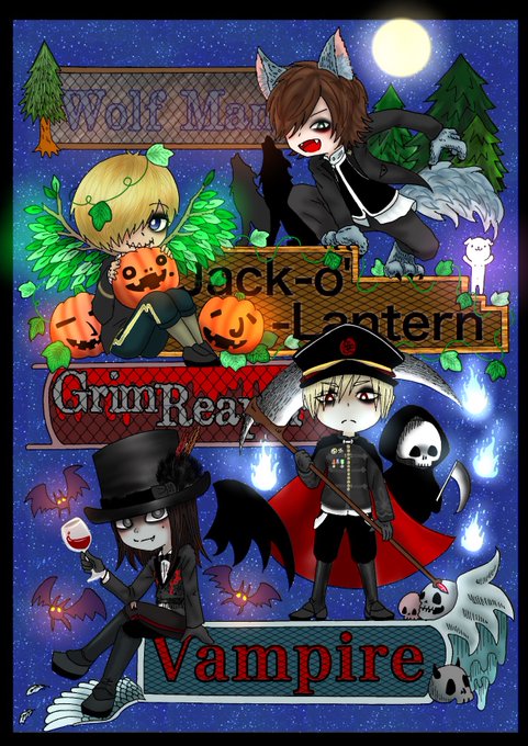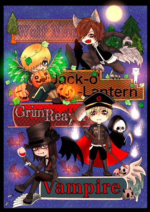 壊れたピアノとリビングデッドを元に、ムックメンバーをモンスター化。 逹瑯→吸血鬼(vampire) ミヤ→死神( Grim Reaper) ゆっけ→ジャック・オー・ランタン(Jack O Lantern) さとち→狼男(Wolf Man) 完成しました! 明るさの違う3パターン。 #壊れたピアノとリビングデッド #壊ピリ