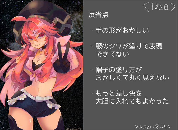 昨日描いたやつ反省点書き出して、ちょっとリハビリ中 右のポーズのがミックちゃんぽいかな てかふつーに褐色に塗ること忘れてた 見本見るのに必死すぎて あとは服のしわの塗りの練習したら2巡目に行けそう