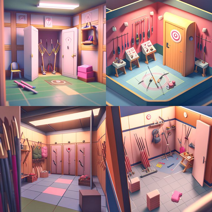 アーチェリー要素が的しか無い。。ロッカールームにしたらなぜか等角図じゃなくなったし、アーチェリーのスポーツ教室にしてみたらはみ出した。