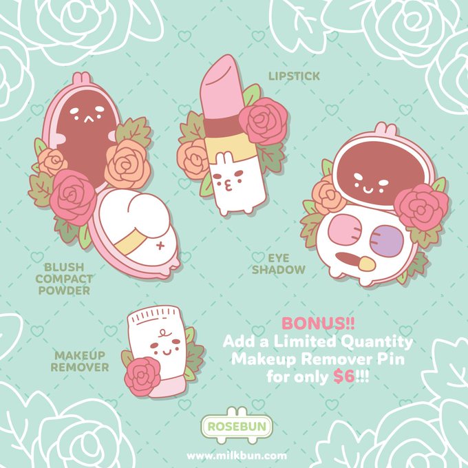 Rosebun beauty products 💄 are printed on rose gold metal with shiny 'mirrors'. The set will come on a lovely backing card. PLUS add an extra pin for only $6!
