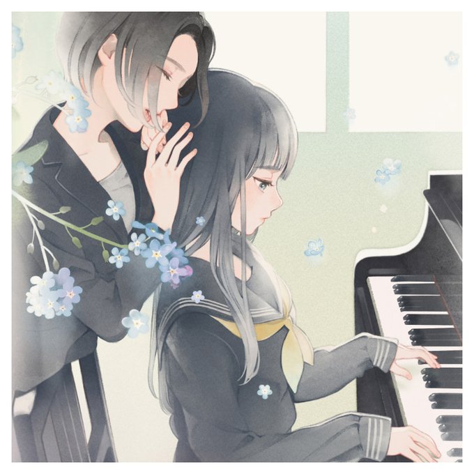 花はワスレナグサ。卒業間近の季節なので、夢を目指す生徒と応援する先生をテーマにしてみました。