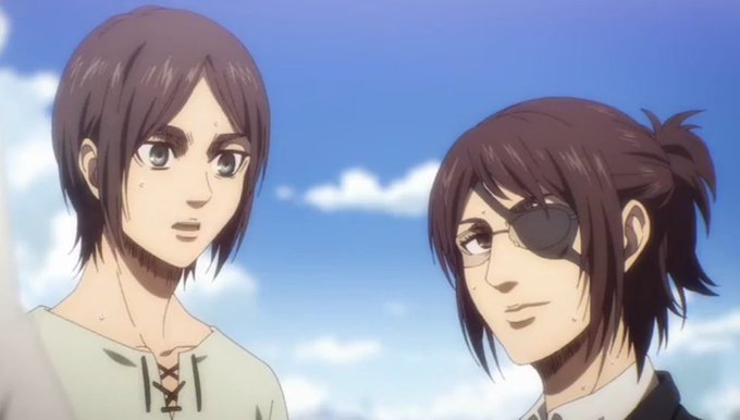 Levi is staring at Hange and Mikasa is staring at Eren. The Ackermans and their lovers