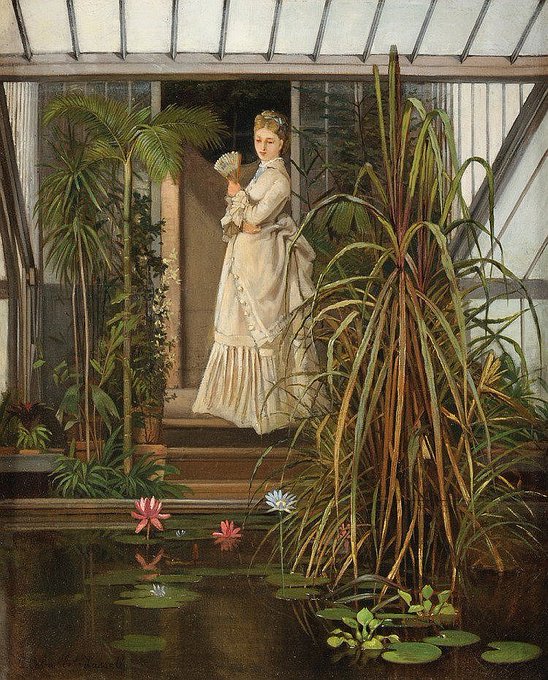 Elegant Lady in a Greenhouse by Camille-Leopold Cabaillot Lassalle (1839-1888), n.d. The pond in the foreground is so peaceful. It seems to show a little bit of her blurred reflection. #Victorian #Art