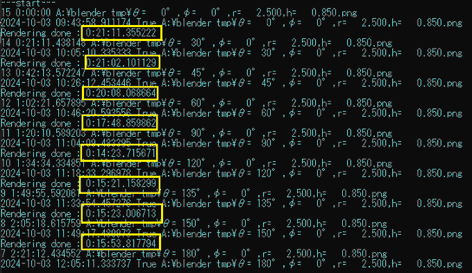 たとえば、1枚あたりレンダリングにかかった時間をpandasのデータフレームに格納させておいて、最後に必要な情報を計算させて、CSVで吐き出させるとか・・・