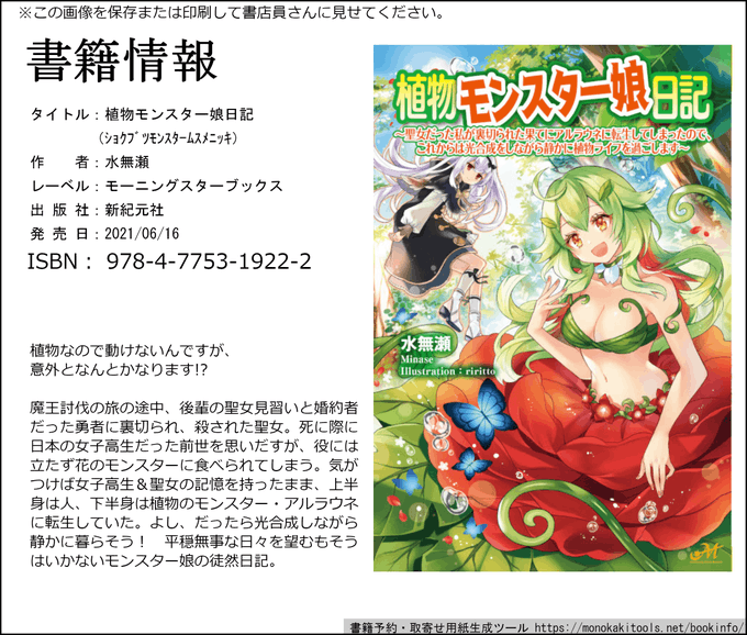 簡単に説明しますと、右の子が転生して左の聖女様になったのですが、いろいろあって植物モンスターのアルラウネになっちゃいます……!
