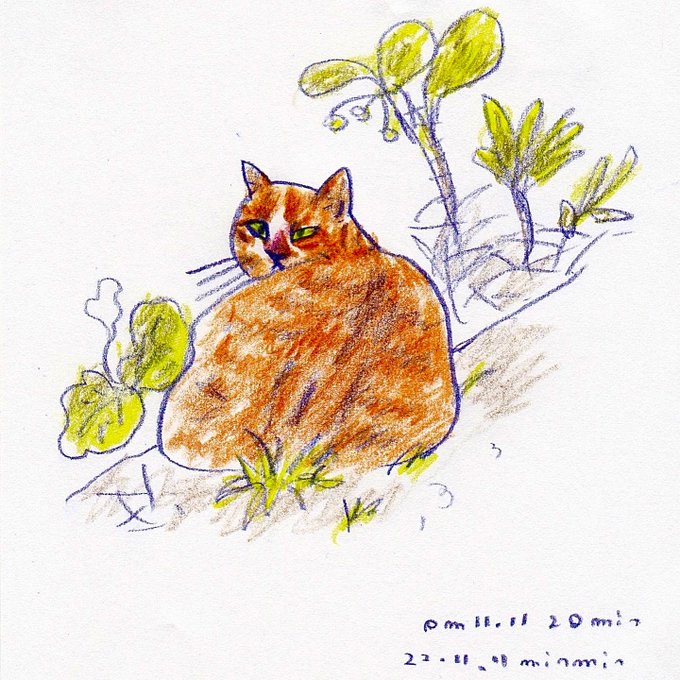 三角の目で睨まれる 睨んでるのか、ムリな姿勢(?)のせいなのか…😂 近づきたいのを我慢 そっと撮らせていただきました😌 #ドローイング #ゆるいイラスト #ゆるいスケッチ #動物イラスト #猫イラスト #猫スケッチ #ご近所猫 #のらさん