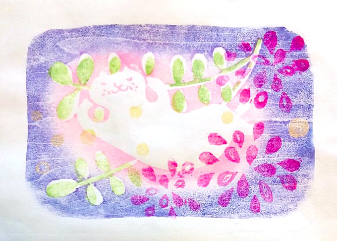 あなぐらにゃんこ にも 虹の雨…✨ * #ゆるいイラスト #らくがきイラスト #木版画 #消しゴムはんこ