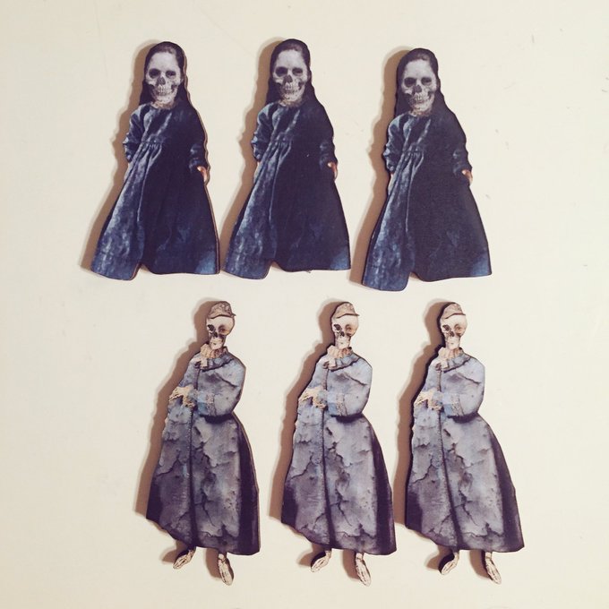 木製ブローチ作る、黒猫、カップケーキうさぎ、鍵穴、ゾンビ、コルセット。失敗しなければ全部で50個くらい出来る。ゾンビは多めに準備してます。