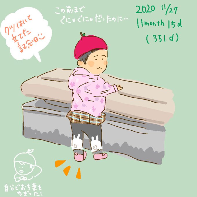 今日の午前中にとうとうつたい歩きが観測された…!!この角度からの動画が録りたいけど録ろうとするとずんずんハイハイで私に寄ってくるから録れない😌😌😌(347d)