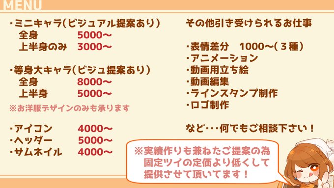 ご依頼提案用ツイです!実績作りのお声がけの為、定価より少しお値段を低めに設定させて頂いております。ご質問などございましたら何でもご相談くださいませ!