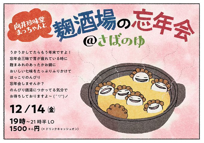 【12/14(菌)麹酒場の忘年会@さばのゆ】 ぼんやりしていたらもう12月! 早いっ! そしてみなさんお忘れかもですが、14日はさばのゆで、向井珍味堂まっちゃんと忘年会ですよ! 鶏たっぷり、麹たっぷり鍋でホカホカして、ゆるゆる呑んで笑いましょ〜♪ 金曜日に菌!