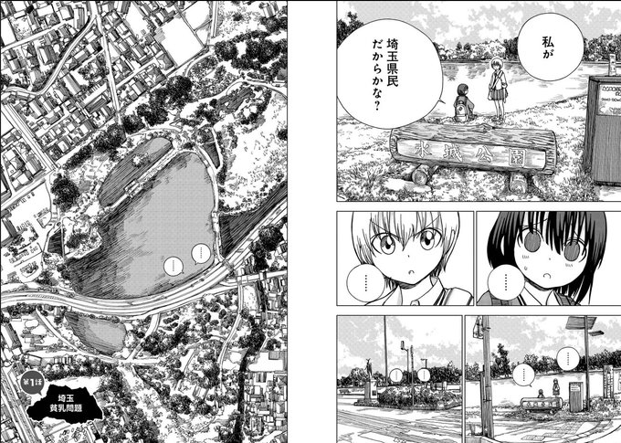 こちらはネットでも読める1話冒頭、2人のアップからどんどんロングの絵になって、さらに1ページまるまる丁寧な空撮(というかもうGoogle Map)の絵になってからのタイトル「埼玉貧乳問題」という流れにはかなり心を掴まれました。できるだけ見開きで読んで欲しい感じ!